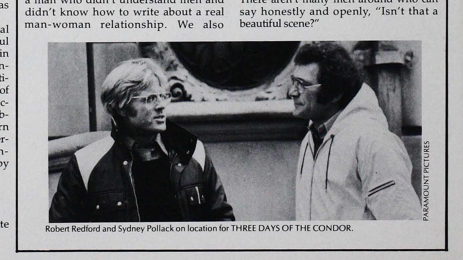 Three Days of the Condor: We usually take something nobody else wants to do. Jeremiah was in existence as a script for a long time. Three Days was a project that was not a very good book and a script that no one liked at all. Sydney and I wanted to attempt a thriller. We wanted to do a pure adventure film, but gradually we got into the area of paranoia. Again we got to the area where there just aren’t simple answers. For instance, you’re hired to protect the interests of the country. Can you spare seven people and lose eight million? It’s an easy thing right now to take a cheap shot at the CIA, just like it’s easy to do a hatchet job on Raquel Welch. Both Sydney and I come from backgrounds that are confusing in terms of what we are now and what we were. Things were wrong. We were both unhappy in misfit situations. That’s why there’s always a complexity in the point of view in all of Sydney’s work, and a look backwards to the past.