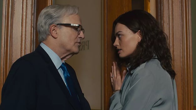 Ella spends much of her first few days in office dealing with her personal baggage. An early flashback of a teenaged Ella introduces her philandering father (Woody Harrelson) as the root of her trauma—a word whose definition she reads aloud from the dictionary for the benefit of her kid brother. (It’s also revealed that Ella got an A on a paper titled “Can There Be Morality in Politics?”) As Ella assumes office, her father shows up in her home state after a long absence, wrangling self-servingly for a reconciliation; her security detail also ferries her over to the apartment of her brother (Spike Fearn), where she worries at him over his agoraphobia and inability to connect with people. And her husband, Ryan (Jack Lowden), portrayed in flashbacks as a Lloyd Dobler–esque teen loverboy who leveraged himself into Ella’s life by making himself into her biggest fan, now feels neglected. Angling for a cushy government post, he also mishandles a brewing scandal about the McCays’ inadvertent misuse of a Capitol Hill apartment for “marital relations,” to quote the flustered governor at a hastily organized press conference.